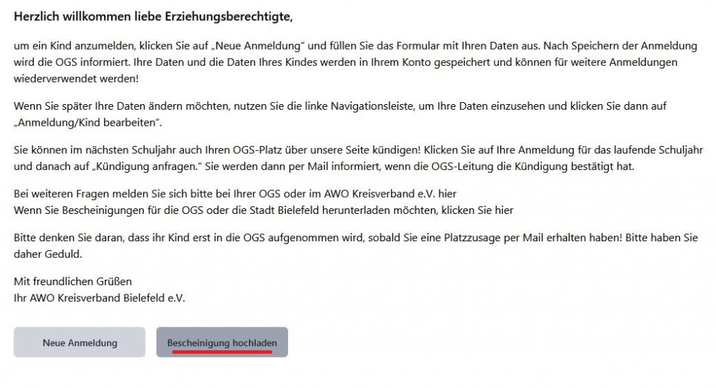 Bitte denken Sie daran, dass hier nur Bescheinigungen über Arbeitszeiten oder Sprachkurse gemeint sind. Einkommens-nachweise werden von der AWO nicht bearbeitet. Schicken Sie diese bitte später an die Stadt Bielefeld (Abteilung Elternbeiträge). Sie erhalten von uns eine Zusage-E-Mail, wenn es soweit ist.